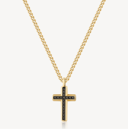 Stainless Steel Gold Cross Necklace Black Enamel Zircons by Brosway