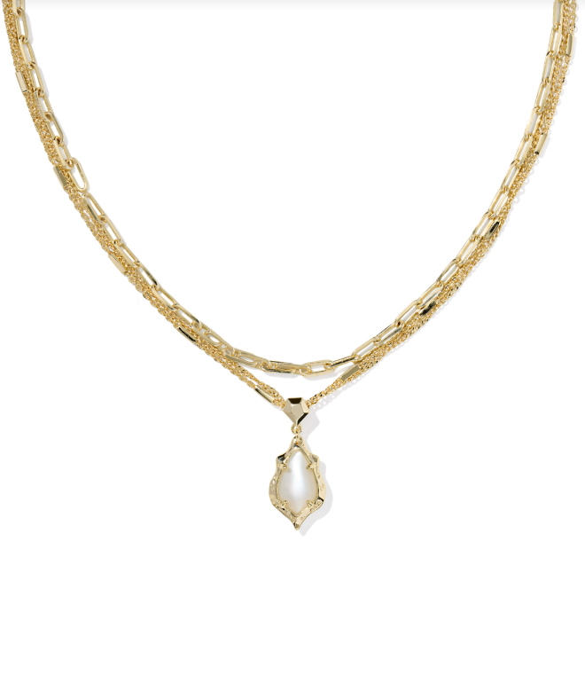Inspired by the gentle sway of grass in the Texas landscape, the Adriana Scallop Frame Gold Multi Strand Necklace features a teardrop shape with scalloped border details. Set on a multi strand necklace with dainty chains, this style is a versatile piece for any outfit.