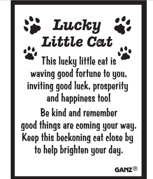 "This lucky little cat is waving good fortune to you, inviting good luck, prosperity, and happiness too! Be kind and remember good things are coming your way. Keep this beckoning cat close by to help brighten your day!"