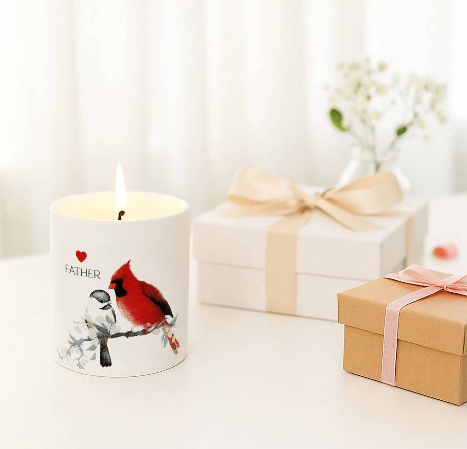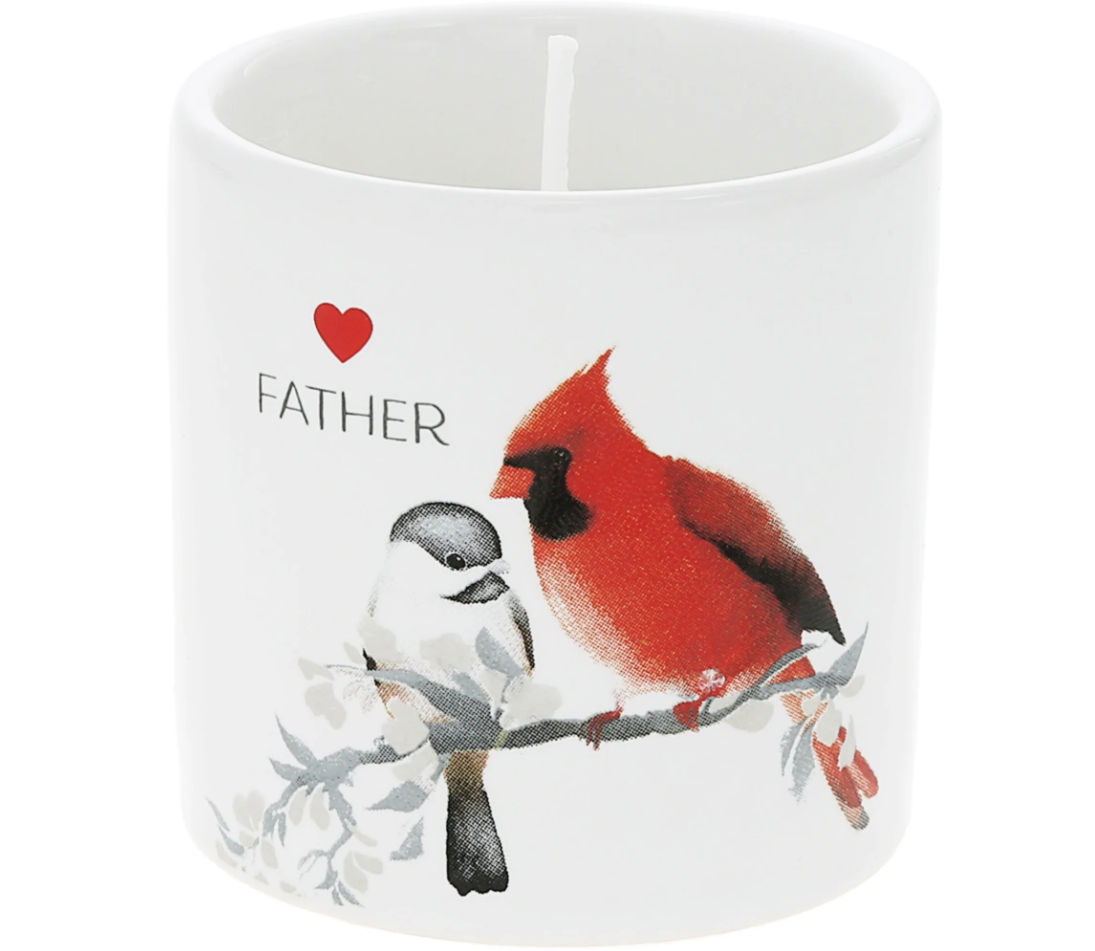 • PREMIUM QUALITY: This 2.5 oz soy wax candle is expertly crafted to emit a gentle tranquility scent while housed in a smooth, glossy white ceramic vessel. Featuring a cardinal and chickadee perched on delicate branches, the design is a powerful representation of guidance, strength, and enduring fatherly love.