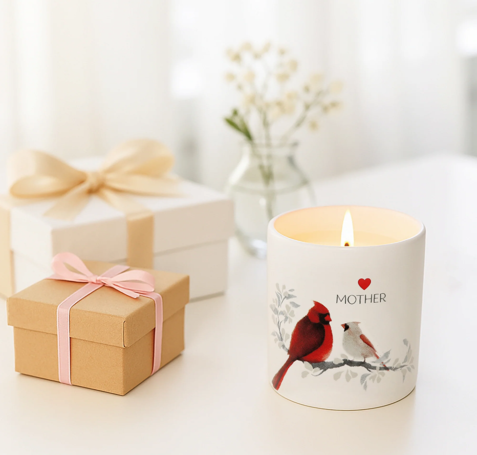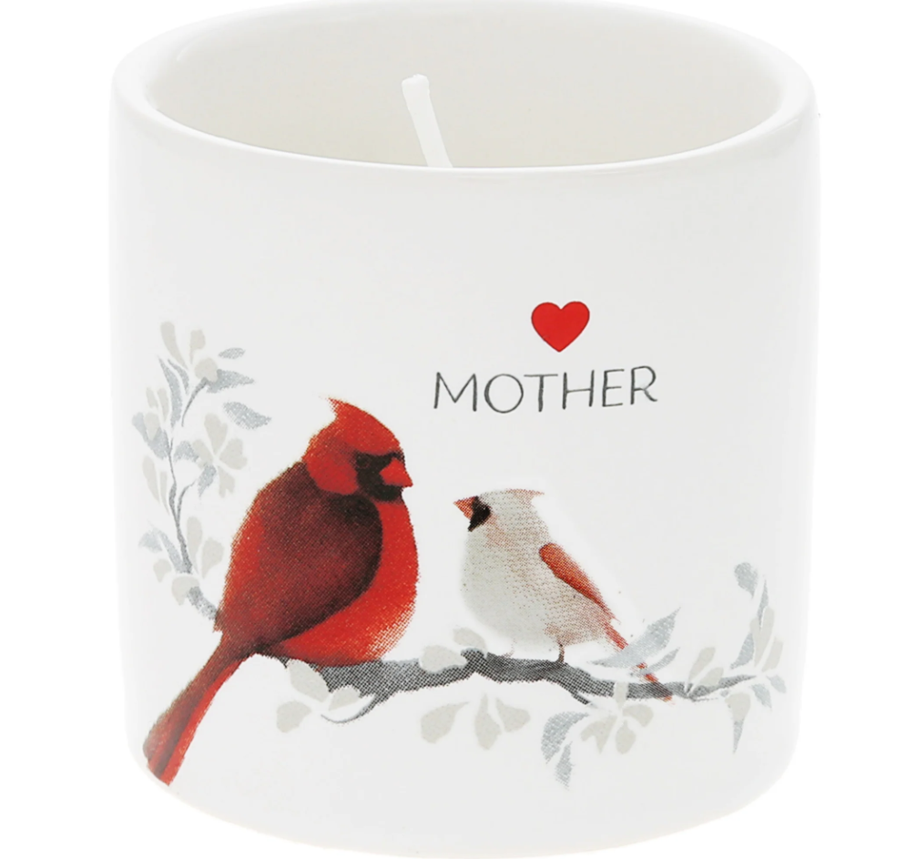 - PREMIUM QUALITY: Crafted with care, this 2.5 oz candle features 100% soy wax and a calming tranquility scent. The high-gloss white ceramic jar is designed to complement any space while honoring the memory or presence of a beloved mother. The detailed artwork includes a single red cardinal perched among white florals, representing comfort, love, and remembrance.
