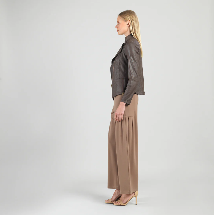 Looking for your new go-to piece that's dependable and grounded in style? Well, look no further than our Liquid Leather Signature Jacket! Made from our beautiful signature stretch knit, extremely lightweight soft "lambskin feel" fabric with an antique-like matte finish. This jacket features a notched lapel with upright collar, long sleeves, gold asymmetrical zip closure, faux pocket zipper slits, as well as complementary detailed front and back stitching.