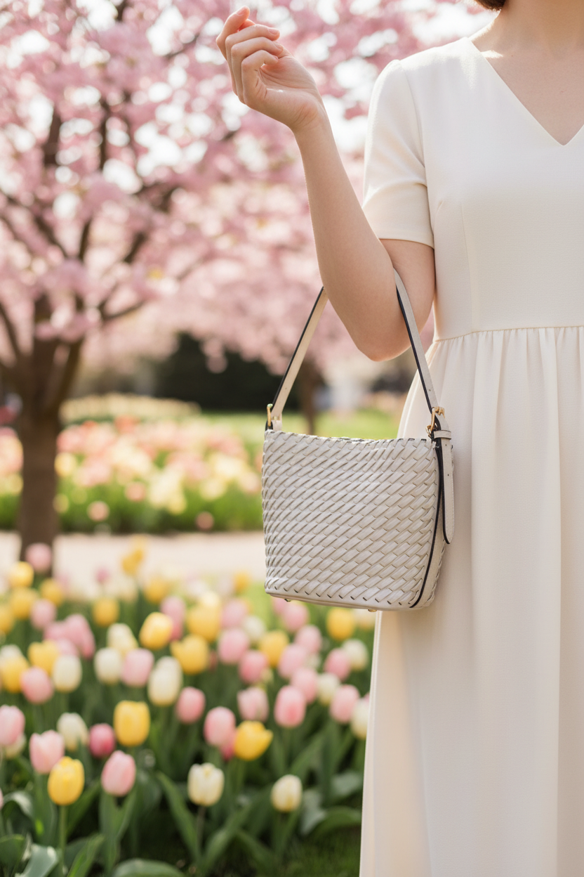 Elevate your everyday carry with the Emerson Diagonal Woven Bucket Bag in Greige. This sophisticated faux leather design features an intricate woven texture that delivers modern polish without the fuss. The spacious bucket silhouette accommodates your essentials while the neutral greige tone pairs effortlessly with any wardrobe. Perfect for transitioning from work to weekend, this piece brings contemporary edge to your collection.